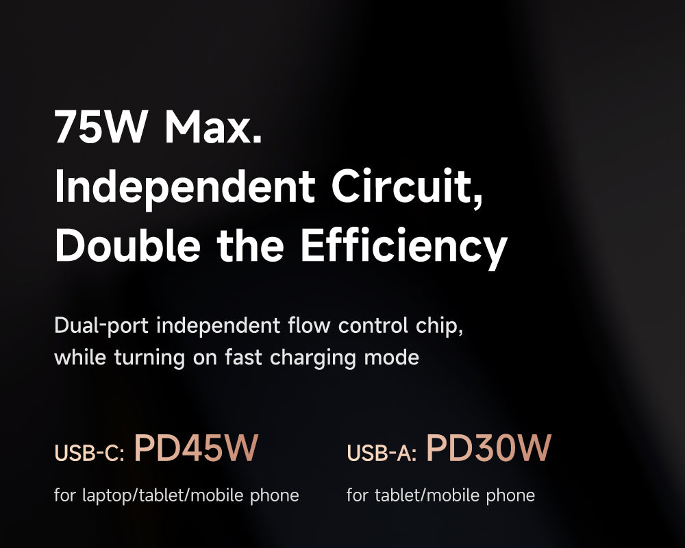 - Total Output : USB + Type-C : 30W + 45W = 75W Max;