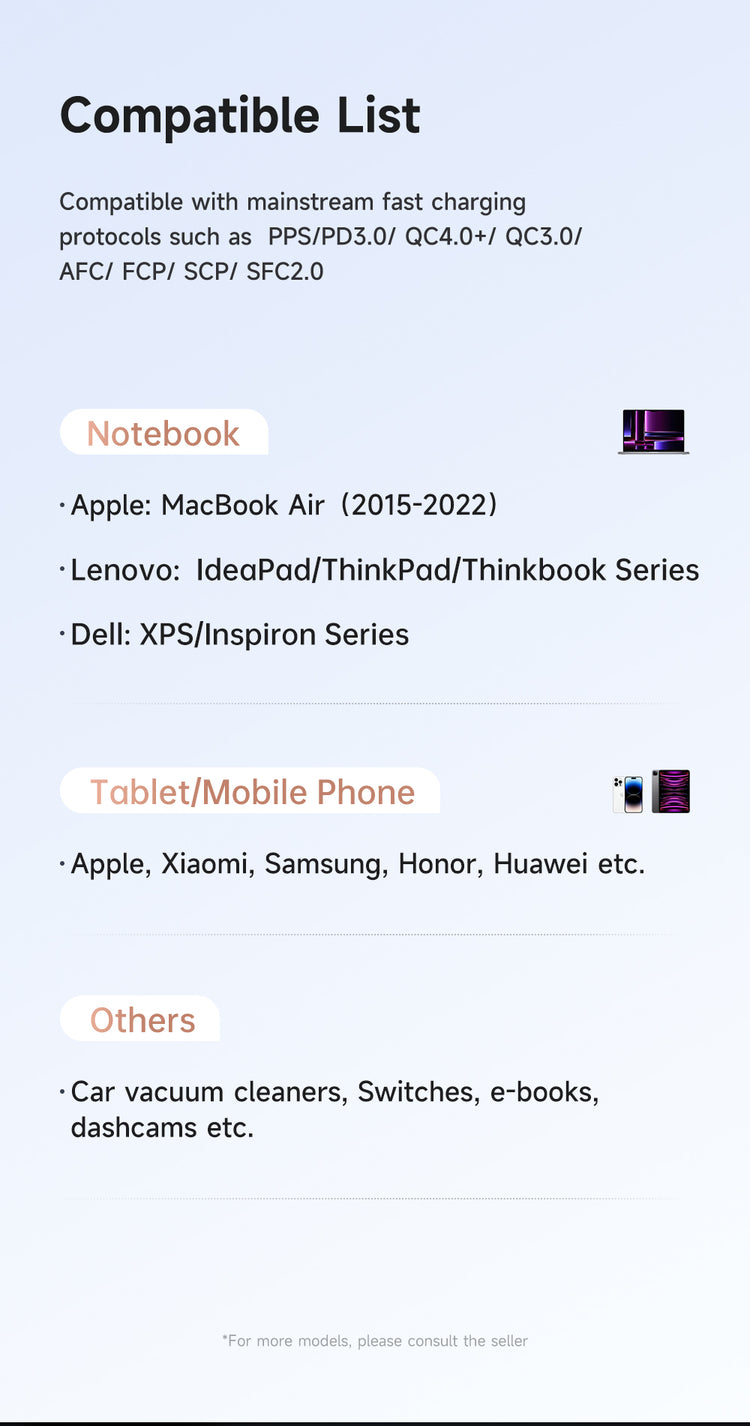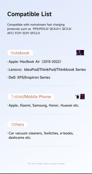 - Supports PD3.0, PD2.0, QC4+, QC4, QC3.0, QC2.0, AFC, FCP, SCP PE2.0 / PE1.1 and SFCP;